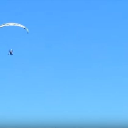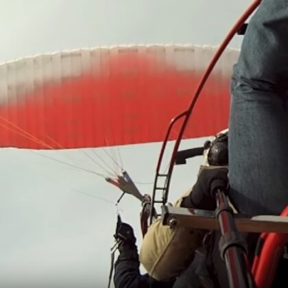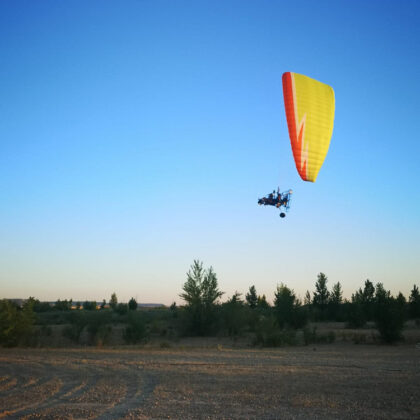 El «trike» o «paratrike» es una estructura metálica de una o dos plazas con ruedas a la que se le ha acoplado un potente motor y una vela de parapente biplaza, pudiendo despegar y aterrizar desde un terreno llano.